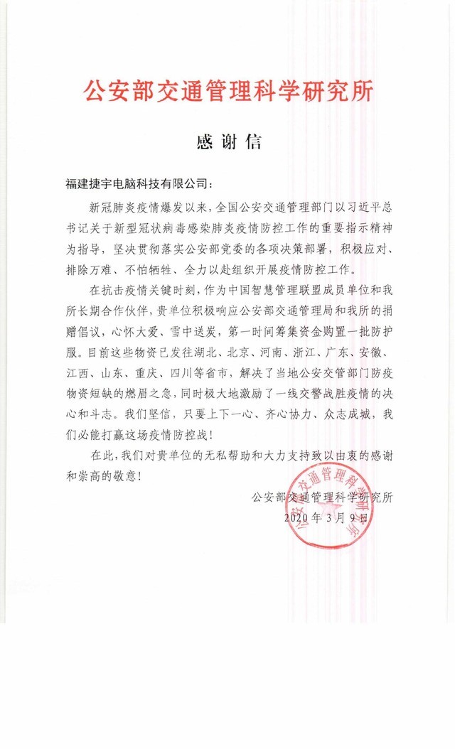 捷宇科技收到来自公安部交管科研所的感谢信
